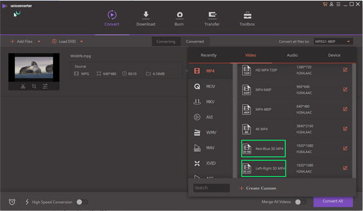 This converter is developed by Wondershare, and you can download it on both Windows and Mac. There are two 3D MP4 options for you to choose from: Red-Blue 3D MP4 and Left-Right 3D MP4.