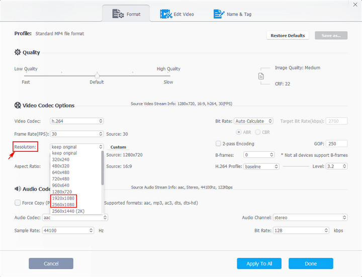 1. To convert a 720p video to 1080p with the best quality, we suggest you not make other changes of the source video, such as the format, codec, frame rate, bitrate and aspect ratio.