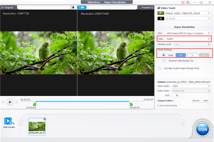 Step 4. Then set the Scale. Choose 2x to upscale the 720p video to 1440p, or choose 3x to upscale it to 2160p (4K). Both options can convert the 720p video to a higher quality effectively. In Super Resolution of VideoProc Converter AI, the maximum output resolution is 4K (up to 4000×4000px).