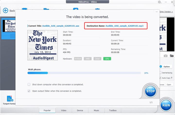 Step 3: Then your AAX files will be converted to MP3 immediately. You can set it to shut down your computer or open the output folder after the conversion completed.