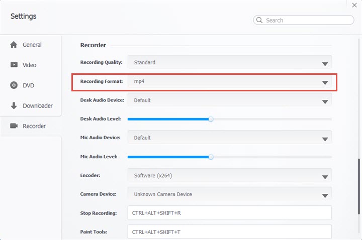 Step 2: Go to the Settings panel in the upper right corner of the interface > Recorder, and in the Recording Format select MP4. In this way, the ARF files will be automatically recorded as MP4 format.