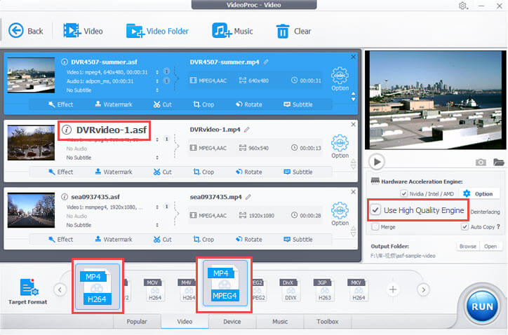 - H265 MP4 is also supported in VideoProc Converter AI. You can convert ASF to MP4 container, with codec MPEG4, H264 or H265 as you wish.