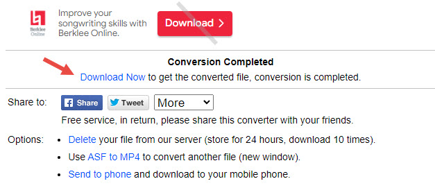The pitfall is, when the download link for ASF to MP4 is prepared, there are some advertisements on the conversion page. You need to make sure to click on the correct area, instead of those Download buttons leading to other ads.