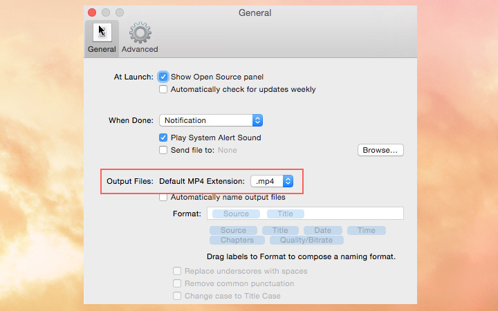 Step 2. Hit HandBrake, choose Preference, and then select .mp4 from the drop-down of Default MP4 extension.