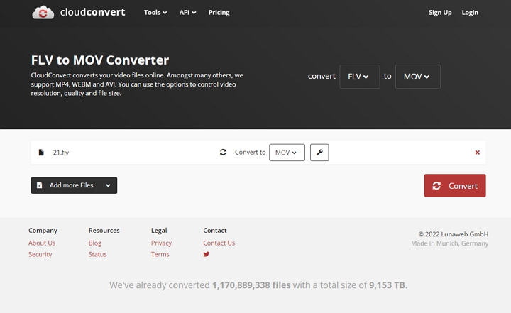 You may convert FLV to MOV for free online with CloudConvert . With support for more than 200 formats, CloudConvert transforms videos with excellent quality. Additional files can be converted, including photos, CAD, documents, audio, ebooks, archives, presentations, fonts, and vectors. Additionally, it allows you to fine-tune your videos by changing its resolution, aspect ratio, audio codec, video length, adding watermarks or subtitles, etc.
