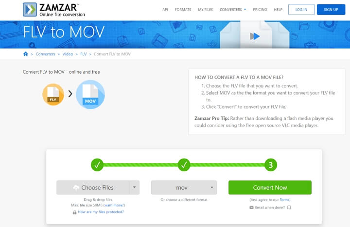 Click Choose Files to select the FLV file you want to convert. Choose MOV as the output format for your FLV file conversion.Click "Convert Now" to start.
