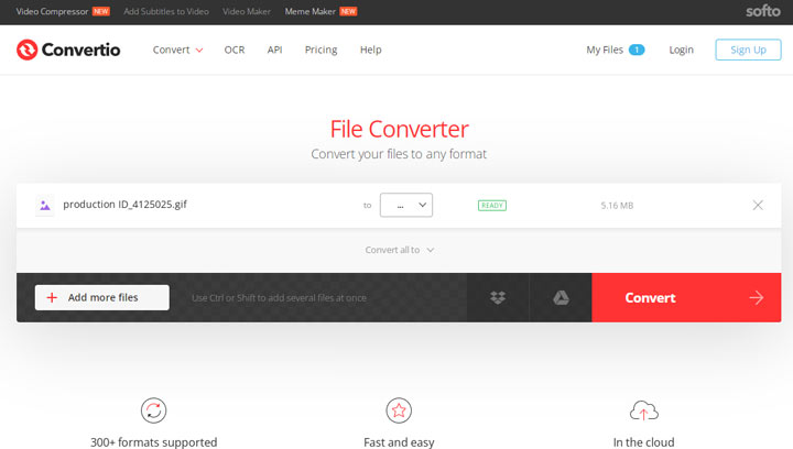With the support of all popular codecs that are compatible with MP4 format, Convertio is a great option for users who want to convert GIFs into H.264/HEVC/MPEG-1/MPEG-2 MP4 videos online. After importing the original GIF file, you can take advantage of the unique Optimize for fast playback start feature to make the outcome more sharable and streamable. We also love its capacity to change the video resolution, length, frame rate, and other parameters, which lets you take full control over the output MP4 file properties. Sadly, it can only convert GIF files under 100MB. To get rid of the limits in size, you have to subscribe to the unlimited plan at the cost of USD50 per month.