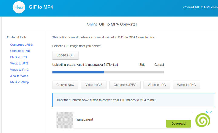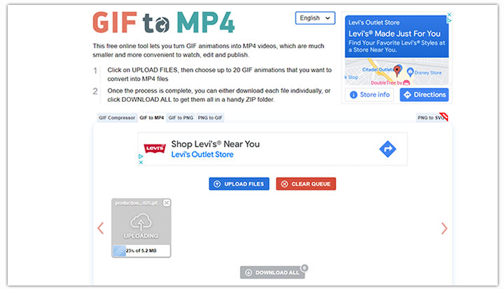 GIFTTOMP4 is a free online GIT to MP4 converter that supports the batch conversion from GIF files (up to 20 pieces) into MP4. However, as we can tell from its name, GIFTOMP4 is too basic, which only serves the target of converting GIF to MP4. There are no commonly used features such as compressing or editing GIFs. From our test, it takes more time to load the uploading GIF file successfully under the same network connection state. Just like most other online GIF to video converters, GIFTOMP4 runs annoying ads. These ads might navigate you to some fraud websites.