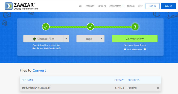 Zamzar, created in 2006, is one of the most long-standing and trustworthy online conversion services. It lets you convert GIF files under 50MBs to MP4, MKV, and a few other popular video formats for free. With the business plan which costs 25USD per month, you can increase the uploading limit by up to 2GBs.
