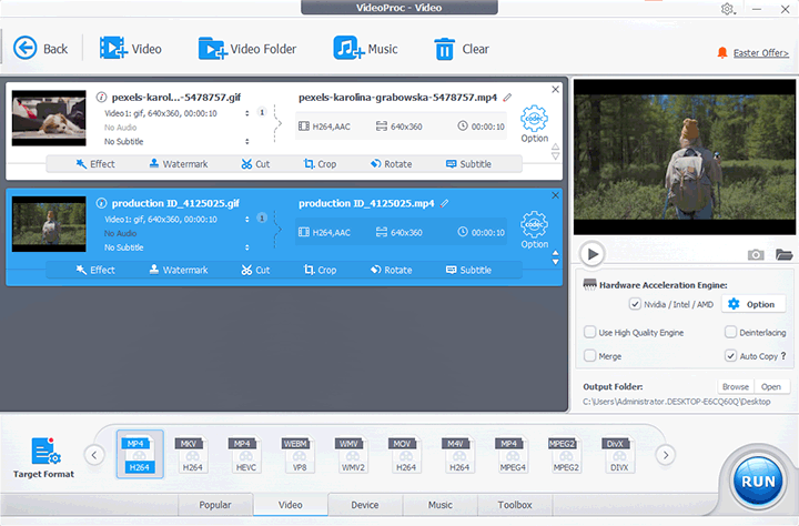 - Choose MP4 H.264 and hit Run to start the conversion from the animated GIF picture to MP4.