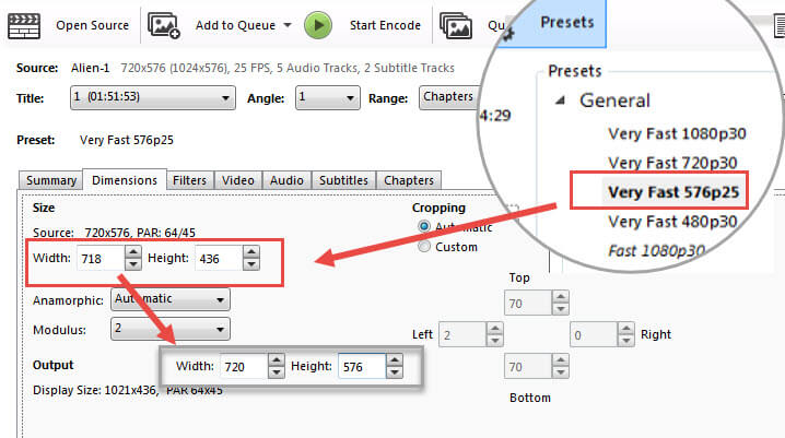 Note: During our test, HandBrake automatically set a resolution of 718x436 in the Dimensions tab, even if the output preset is 576p25, the same as the source file 720x576@ 25FPS. Therefore, we had to manually adjust the width and height back to 720x576.