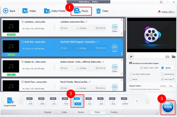 VideoProc Converter AI is a great option if you're searching for a reliable and simple-to-use tool to convert your M4A files to FLAC. You may quickly and easily convert M4A to FLAC with this robust program. It is an all-in-one video processing tool that can perform a variety of tasks, such as audio conversion, video editing, DVD ripping, DVD backup, video downloading, and video conversion. GPU acceleration technologies are used by VideoProc Converter AI to guarantee that your M4A files' audio quality is maintained throughout the conversion process. The original audio information is preserved in the converted FLAC files, which are of the finest quality.