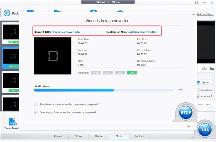 Step 3. Then it will convert M4A to FLAC immediately. You can also let VideoProc Convert open the output folder or shut down your computer when conversion is completed..