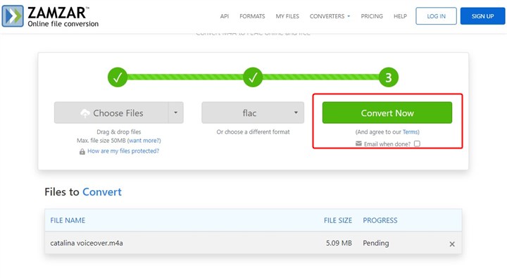 If you need to convert M4A files to FLAC but don't want to download and install any software, Zamzar is a decent choice. Because of this, it's an useful choice for individuals who don't want to fill their hard disk with unnecessary programs. Moreover, Zamzar has a straightforward user interface. However, Zamzar can occasionally be laggy, especially when converting large files. If you're in a rush and need your converted file right away, this can be frustrating. There is a daily conversion restriction for the tool's free edition, which allows you to convert files up to 50 MB in size.