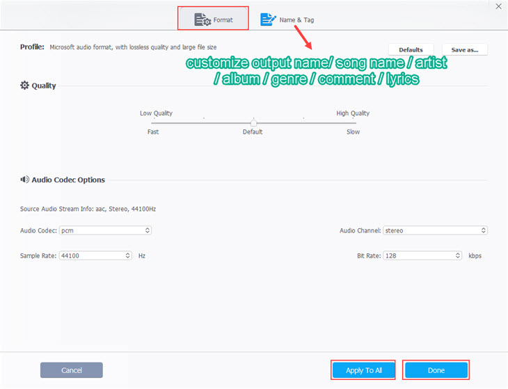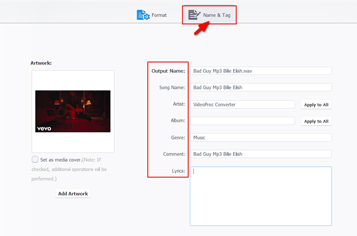 Click Name & Tag to edit metadata like the Output Name, Song Name, Artist, Album, and Genre, etc.- 2. Choose another audio file format via the Target Format tab.