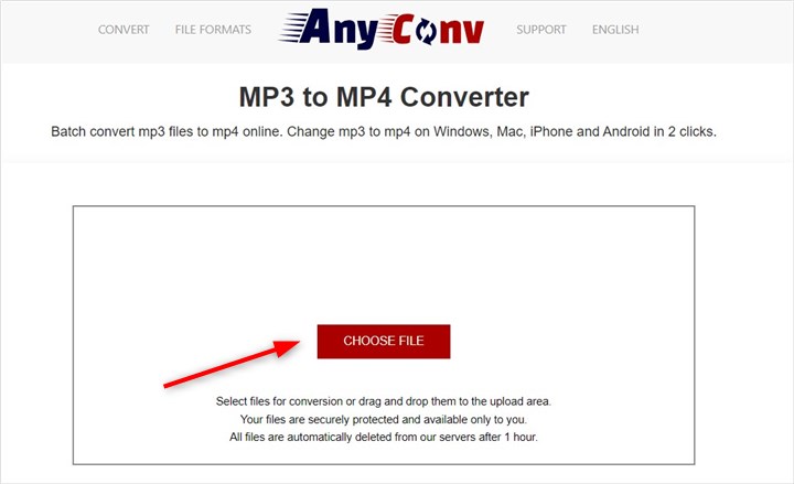 AnyConv is also a useful online MP3 to MP4 converter that helps you change MP3 to MP4 within simple steps. It supports converting videos, audio, ebooks, fonts, documents, images, archive, CAD, and more. It supports changing mp3 to mp4 on Windows, Mac, Android, and iPhone in 2 steps. In addition, it supports many other formats like WMV, MKV, MOV, WebM, AAC, AC3, FLAC, WAV, M4A, and more formats.