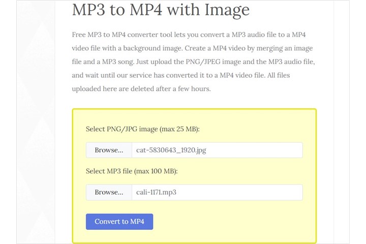 Click CHOOSE FILE to upload your MP3 and click CONVERT button to start converting mp3 to mp4 video file.