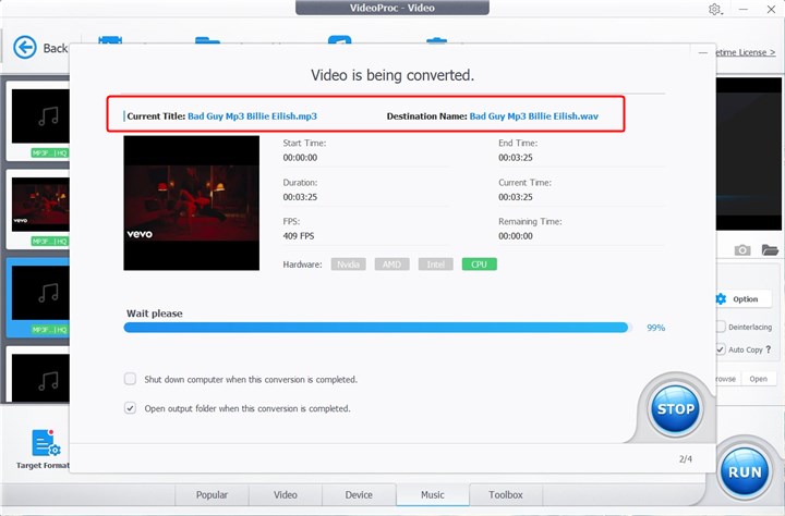 Step 3.Then it will immediately convert your MP3 files to WAV files. After the conversion, you can choose to either let VideoProc Converter AI shut down your computer or access the output folder.