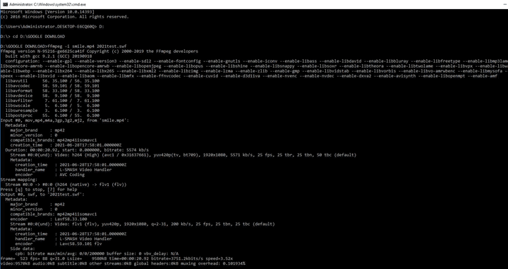 In my case, the name of my original file is smile.mp4, and I wish to convert it to SWF and name the outcome as 2021test. Thus, the command line I input is: ffmpeg –i smile.mp4 2021test.swf.