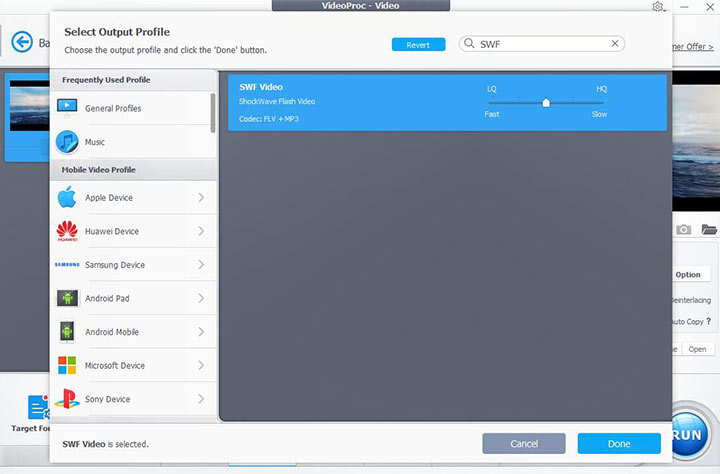 Navigate to Target Format. Press the small gear icon aside from it. This can lead you to the Select Output Profile panel. Enter SWF on the search bar to locate SWF. Select it. If necessary, drag the quality slider left or right to save the SWF with a smaller file size or a better picture quality.