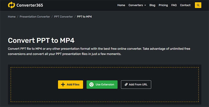 However, they are very easy to use and no software download is required. Follow the steps below to convert PPT to MP4 online with Converter365.