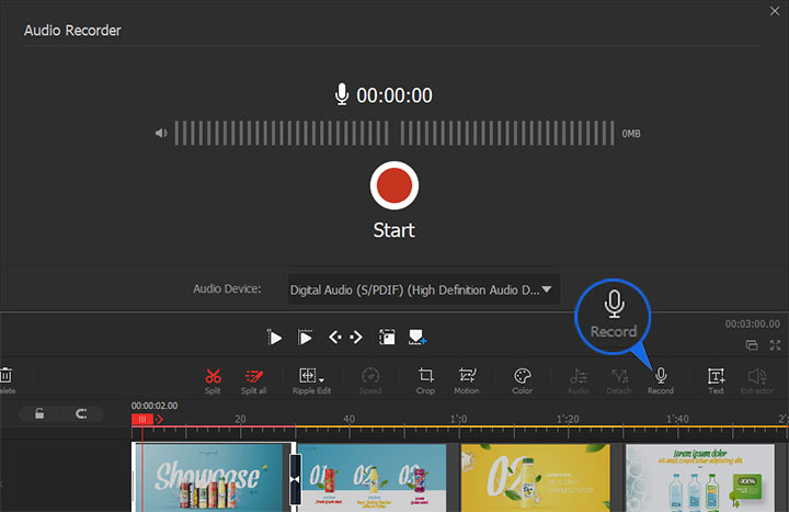 Move the red Playhead to where you want to start the narration and click the Record button in the Toolbar. Select the Audio Device and hit Start to voice over your PowerPoint.