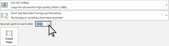- Don't Use Record Timings and Narrations: The duration of each slide within the video will use the duration you specify in the Seconds spent on each slide box (5 seconds by default). No narration will be used in the video.