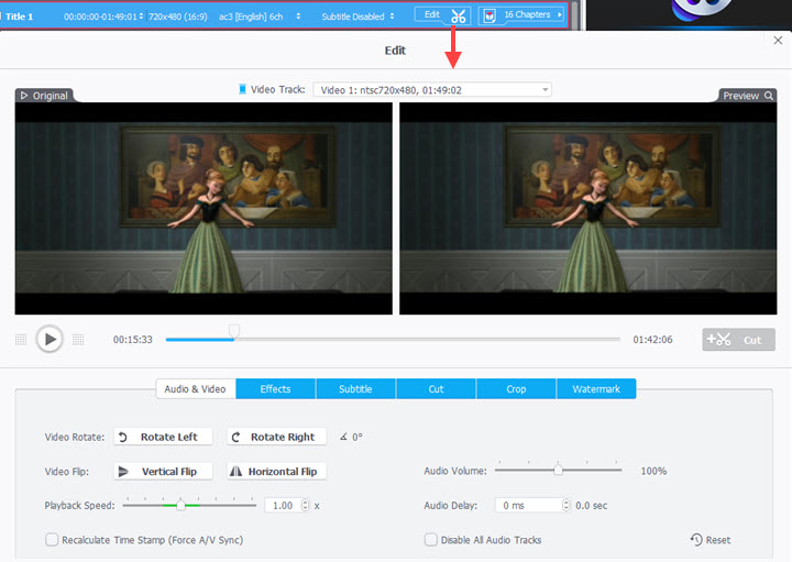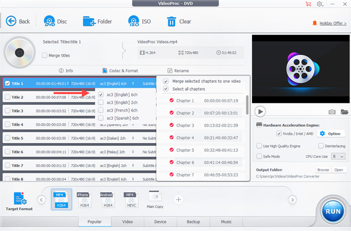 Step 3. Select the title, chapter, and subtitle track. VideoProc Converter AI reads all the titles and data in the VIDEO_TS folder. You can keep default settings that keep the title with all chapters contained or check the one you need.