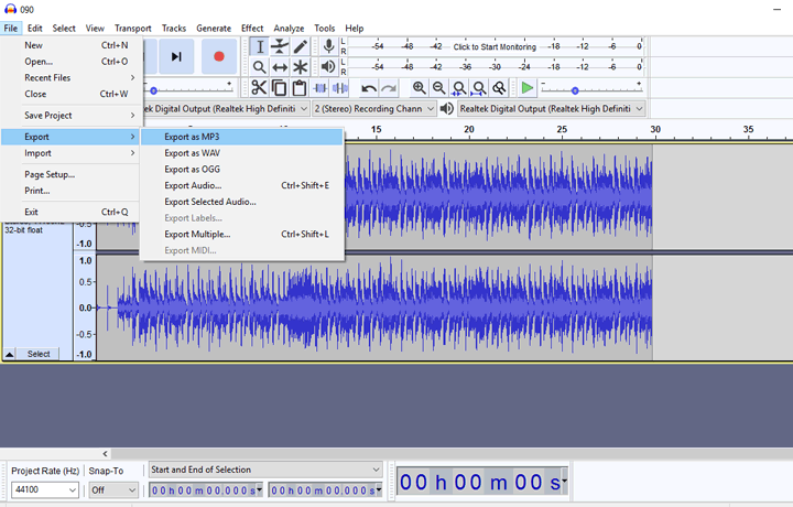 Step 4. Hit File > Export > Export as MP3. Name the output MP3 file and hit Save. Audacity starts to convert your WebM file to MP3.