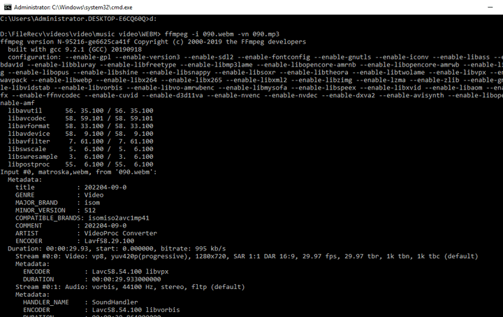 Step 11. Enter the below command line and press Enter to enable FFmpeg to convert WebM to MP3.