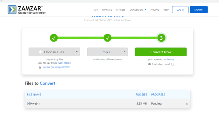 If you start searching for online file conversion tool recommendations, you're going to come across Zamzar. It's an online and free web-based media conversion application that can handle the conversion from video to audio, PPT to DOC, CDR to AI, PSD to JPG, audio to audio conversion, etc. The major plus of Zamzar is it allows you to convert WebM to MP3 with a simple click. However, unfortunately, its simplicity comes at the expense of functionality. There aren't any extra options to adjust the audio qualities, sample rate, or other encoding properties. The upload file size limit for a free account of Zamzar is 50 MB. You can convert WebM files up to 2 GB if you subscribe to its business plan (25USD/month).