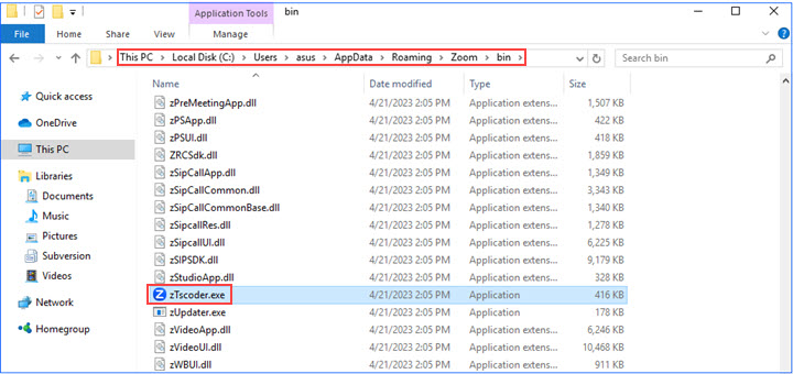 Step 2. Open folders in C:\Users\UserName\AppData\Roaming\Zoom\bin. Select zTscoder.exe and click Open.
