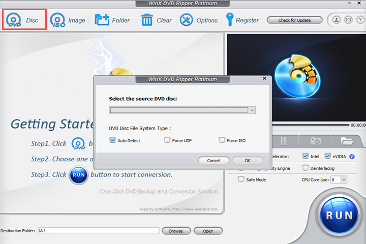 Step 2. Insert your DVD, click DVD Disc button on the interface of WinX and load the DVD content.