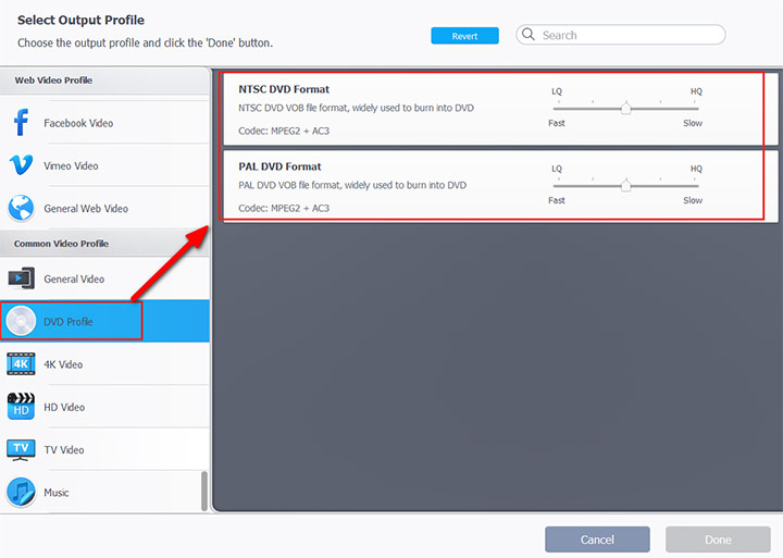 If you want to convert the DVD into the file that is easy to burn into a DVD, you should go to the "DVD Profile" under Common Video Profile. There you can choose NTSC DVD format (North America and Japan) or PAL DVD format (Europe and Australia).