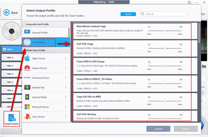 You can find options in "Target Format" > "DVD Backup" and "DVD Profile" in which you are enabled to copy the DVD to ISO image files, VIDEO_TS folder, MKV, etc. You can also choose MPEG2 or VOB files in the list of video formats.
