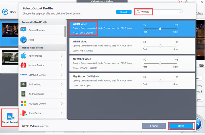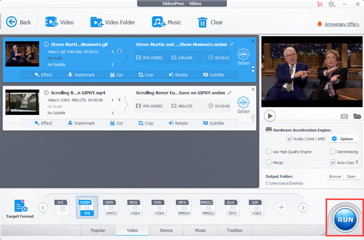 VideoProc Converter converts GIF to WebM videos under 5 minutes for free. You can upgrade to full version to enjoy more features without time limits.