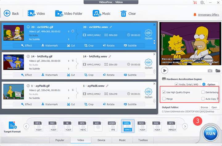 Check Use High Quality Engine and uncheck Auto Copy. Hit RUN to start converting GIFs to WMV.
