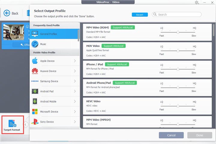 To convert GoPro videos to H.264, MP4, MOV, AVI, and more, go to the Target Format list in the bottom left, where you could find myriads of video profiles to work with. Select your desired output format in the Target Format list,