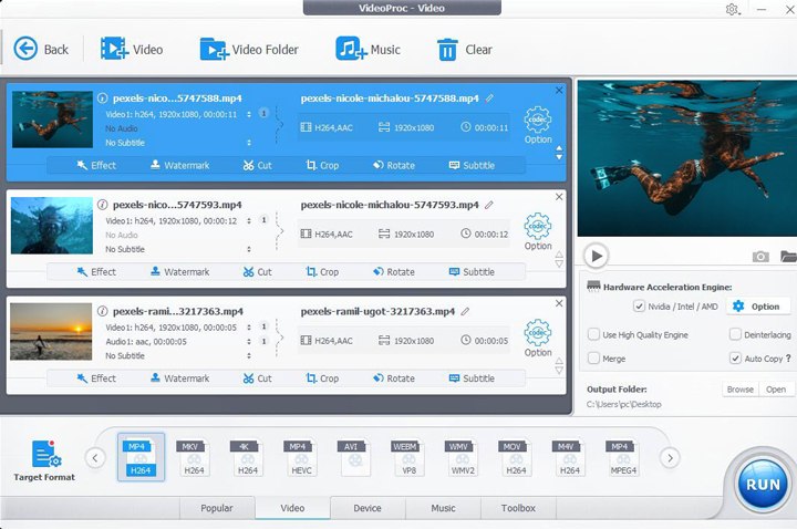 As a robust GoPro video converter that that encompasses 370+ codecs and accepts GoPro 5.3K 60fps/4K 120fps/1080p videos, VideoProc Converter AI enables you to convert GoPro HEVC 5K/4K video to H264, MP4, MOV, MKV, AVI, FLV, VOB, MP3, AC3, iPhone ringtone, etc., and won't pose any damage to the video quality.