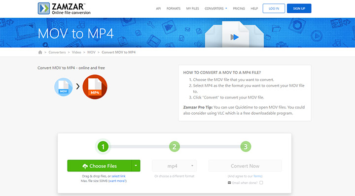 Zamzar is an online media conversion service, through which you can convert iPhone videos to a number of video types, including MP4, WebM, MOV, AVI, WMV, and MPG. Zamzar is designed for rapid use. After you upload the source iPhone video file and choose the output format, it will start the conversion. You get no options to adjust the video codec, resolution, or other encoding options. Worse still, Zamzar doesn't let a free account convert the iPhone videos over 50MB.