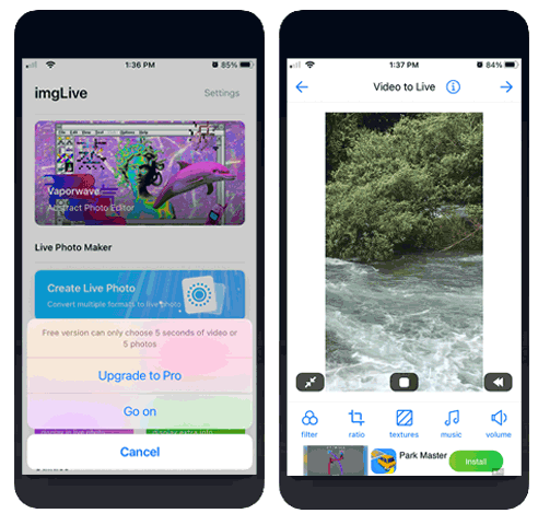 If you are looking for a free, well-designed, and feature-rich method to turn a video into a Live Photo, give imgLive a try. Its free version lets you turn a video within 5 seconds to a Live Photo (After upgrade to the premium account, the limit on length turns to 30 seconds). The rich extra features are the most alluring part about imgLive. With it, you can split one video into couple Live Photos, and repeat the video display in Live Photo, etc.