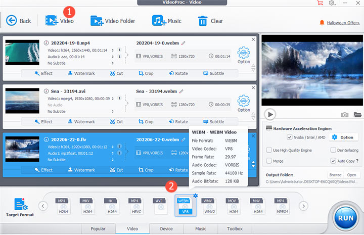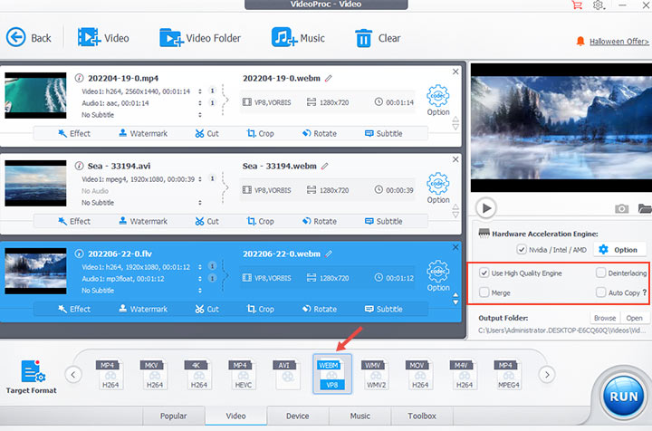 Step 3. Uncheck Auto Copy. Select High Quality Engine. If you need to convert multiple videos into one single WebM, choose Merge. Hit RUN to start making WebM via VideoProc Converter AI.
