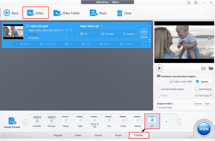 2. Choose the +Video button to load the saved Instagram video, jump to the Toolbox at the bottom of the software, find the GIF feature, and double-click on it.