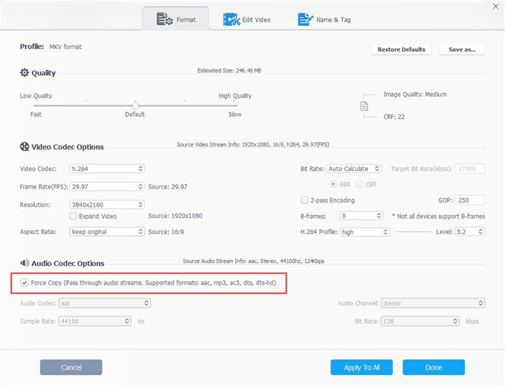 1. Click the Option button > Format, and in Audio Codec Options, enable Force Copy, which will pass through audio streams formatted in AAC, MP3, DTS, and DTS-HD.