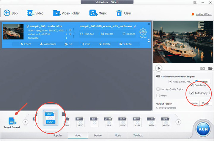 2. Return to the interface, and enable the Auto Copy option sitting above the Run button to retain the 1:1 m2ts to mkv audio and video quality.