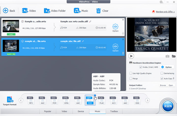 The built-in music converter of VideoProc can help convert M4A to AIFF on Mac. It's compatible with macOS 10.13 and later. Launch the program after installation. Go to the Video module and add the M4A files using the +Music button. Select AIFF as the output format. Then you can click the RUN button to start converting M4A to AIFF.