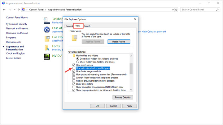 Step 2. Reveal the extension of file types. In the pop-up Control Panel window, choose Appearance and Personalization > File Explorer Options. Under File Explorer Options box, go to View tab > uncheck the Hide extensions for known file types option > click on OK/Apply.