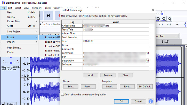 Choose the output location and confirm it. Audacity will also launch up the metadata editor upon exporting. You can edit title, artist, comment and other information for the M4B audiobook before export. Hit OK and Audacity will start to convert M4B to MP3.