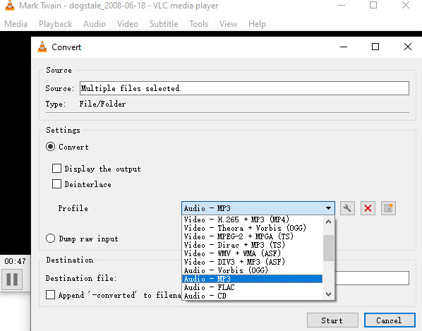 Select output destination and click Start to let VLC convert M4B to MP3.