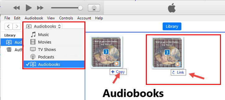 Click the Music tab to trigger the drop-down menu, and from here you can click the Audiobooks tab to make the switch. It is your audiobook collection on the computer or from the iTunes store. If it is empty, you can import the M4B audiobook file by linking to it or copying it to the iTunes library.